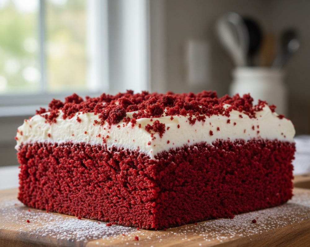 Ingredients: Flour, Sugar, Whipping Cream, Butter, Eggs, Oil, Cocoa Powder, Salt, Baking Soda, Vanilla Extract, Red Food Coloring, Powdered Sugar
